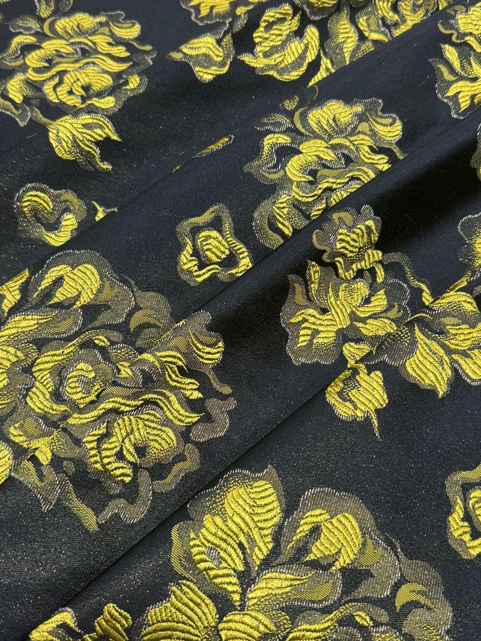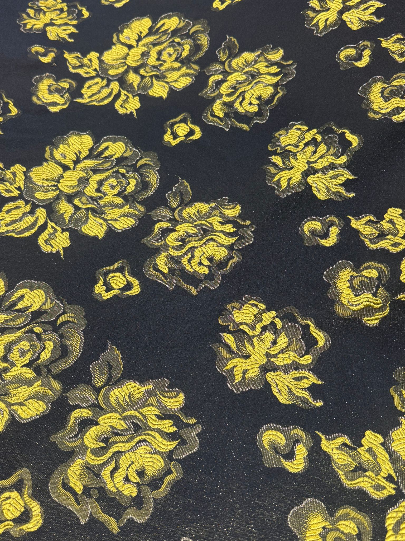 A classic, high-impact brocade in a rich black base with yellow rose motifs woven throughout for a luxurious, textured finish. The metallic and viscose threads give the design depth and a subtle shimmer, making this fabric perfect for statement pieces and occasionwear.