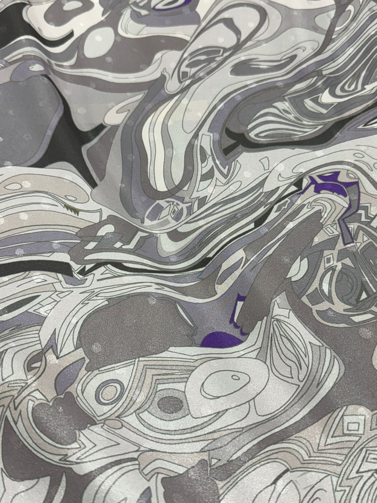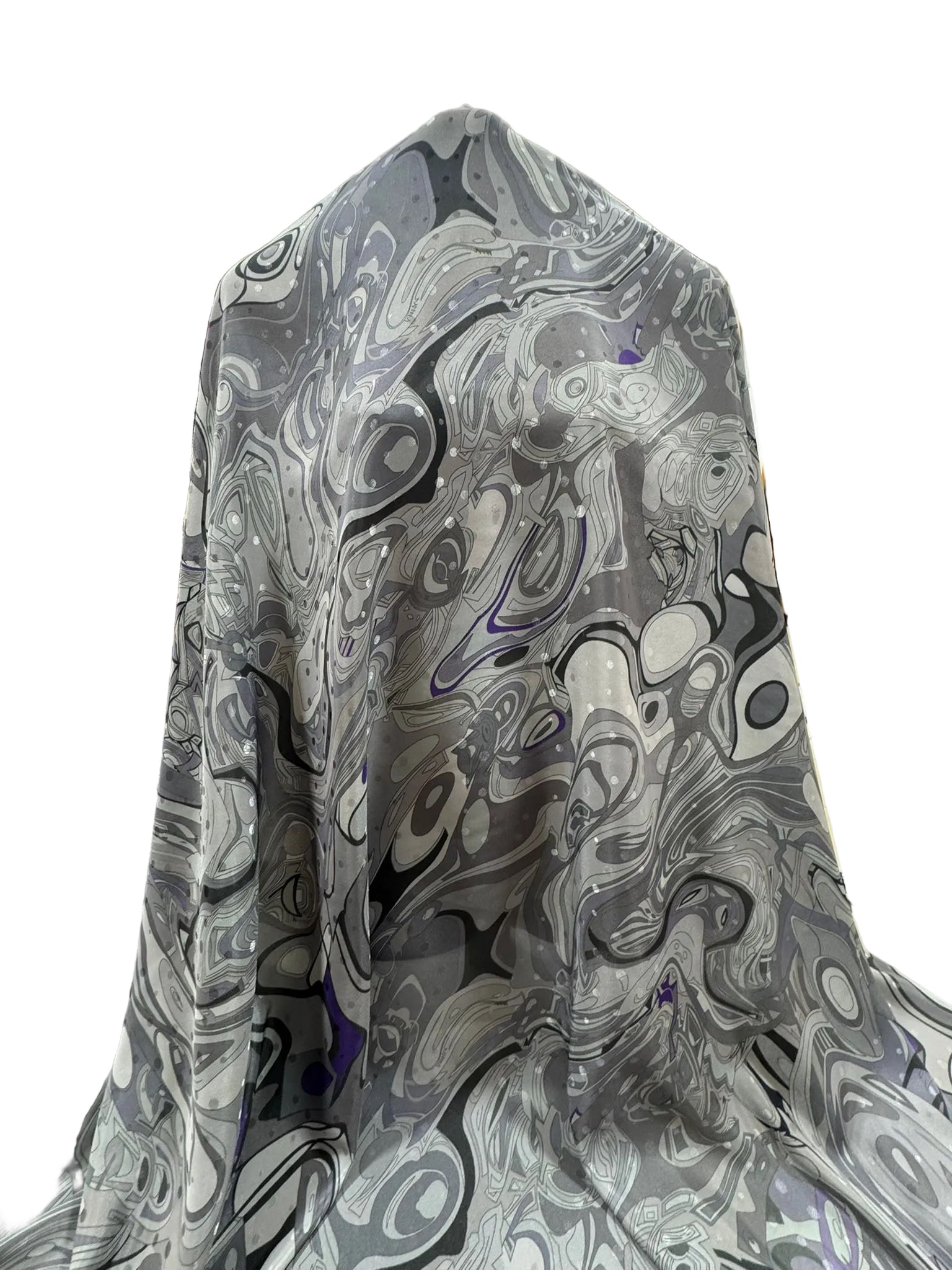 Make a statement with this modern abstract swirl print in layered shades of grey, charcoal and soft lilac accents. The design has a sleek, contemporary feel and the fabric drapes beautifully, making it a strong choice for both everyday wear and standout occasion pieces.
