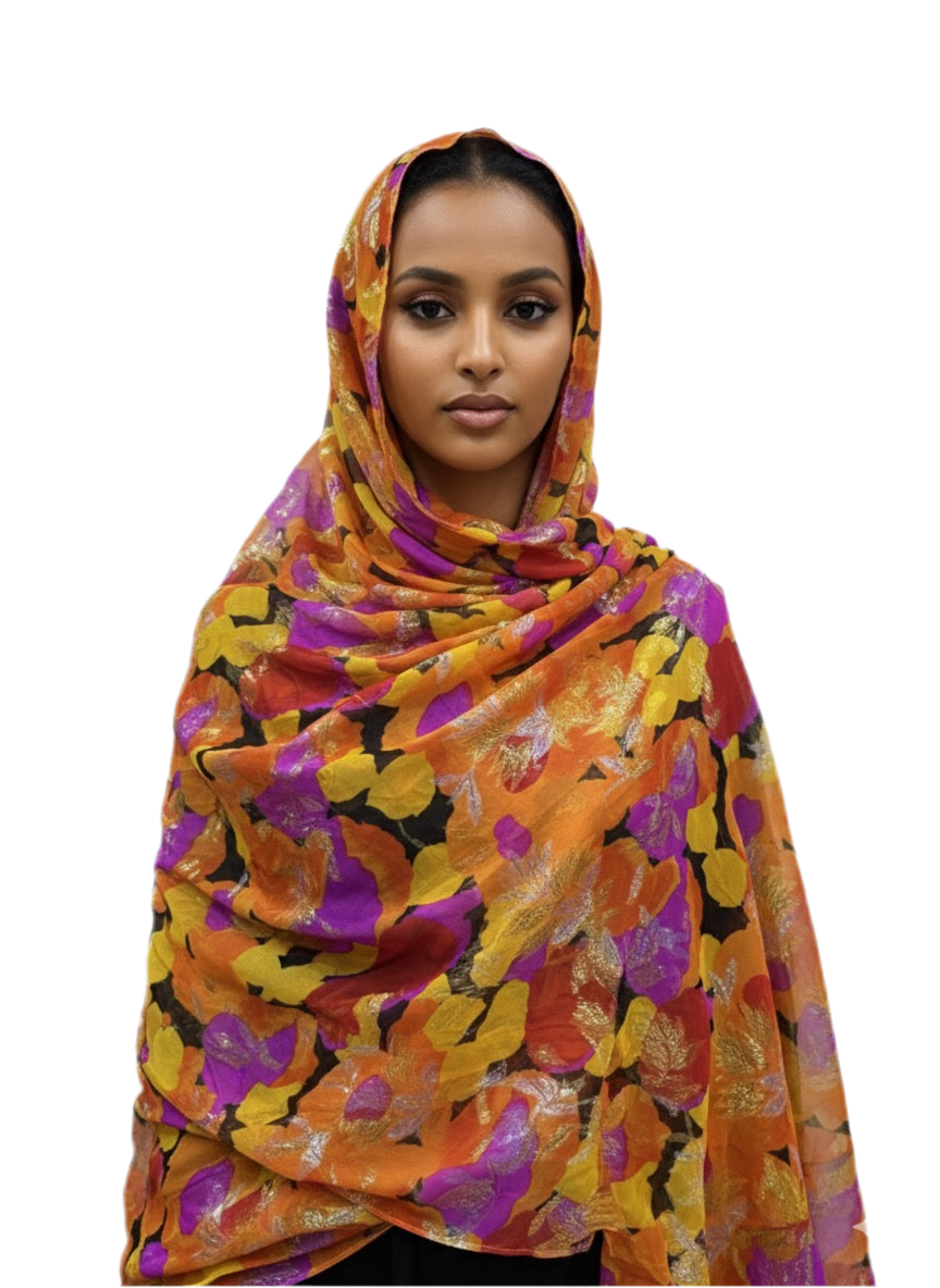 A striking silk chiffon fabric featuring bold floral prints in orange, fuchsia, yellow and black, beautifully highlighted with delicate gold and silver lurex threads. Lightweight, elegant and perfect for a Somali gabasaar.