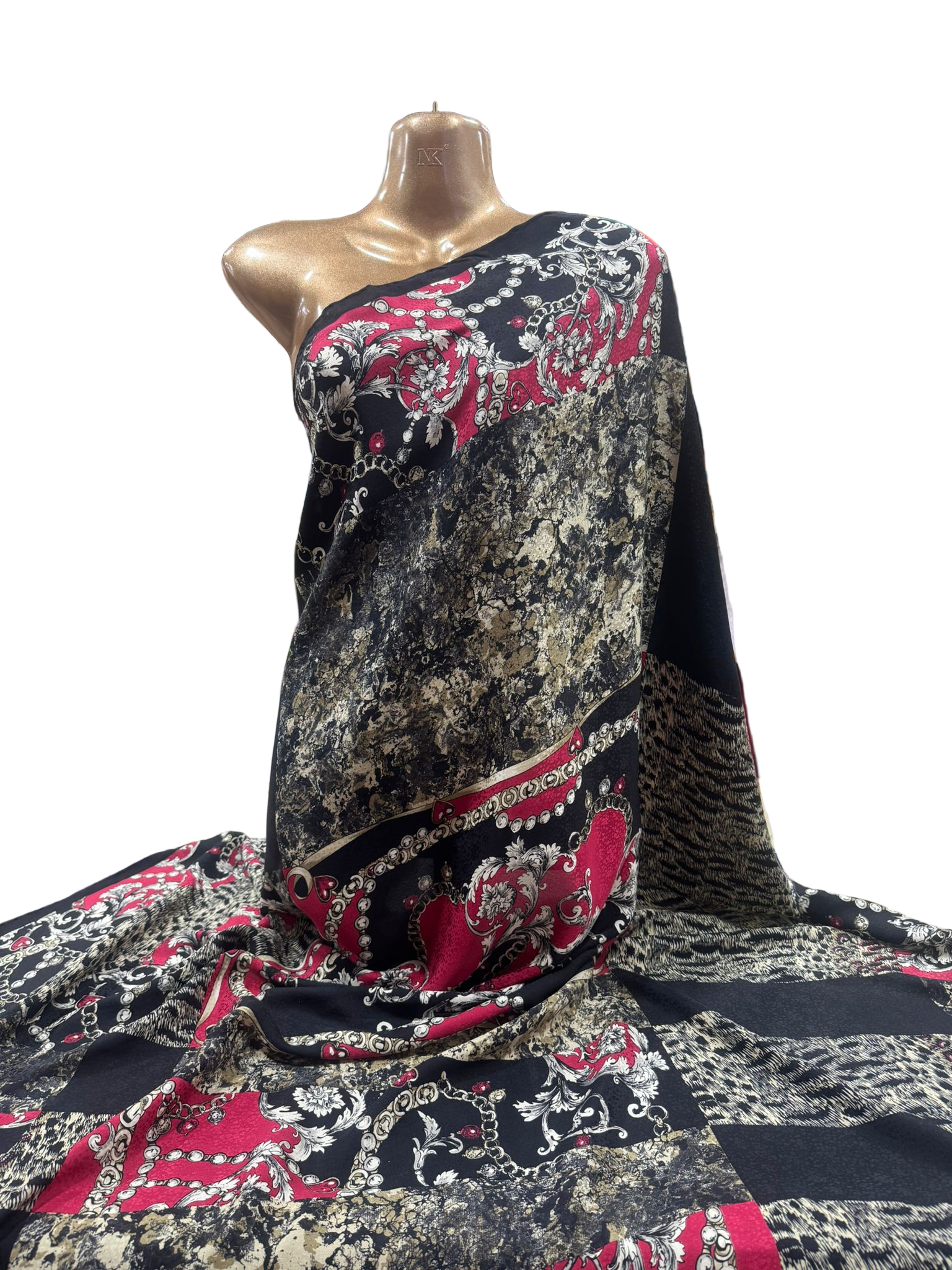 Elevate your wardrobe with this exquisite 100% silk square scarf, featuring a striking baroque-inspired design in rich tones of black, deep red, and antique gold. The elegant pattern combines ornate scrollwork, jewel motifs, and marbled detailing — creating a perfect fusion of classic luxury and modern edge.