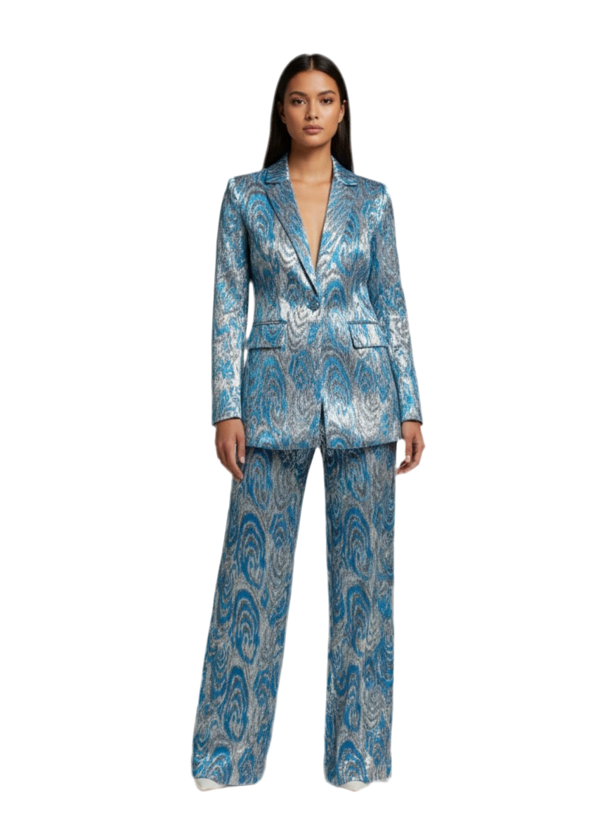 Add instant glamour to your creations with this metallic velvet-style fabric, featuring a striking blue and silver swirl pattern. With its soft texture, shimmering finish, and bold design, this fabric is ideal for eveningwear, statement suiting, dresses, jackets, or even interiors.