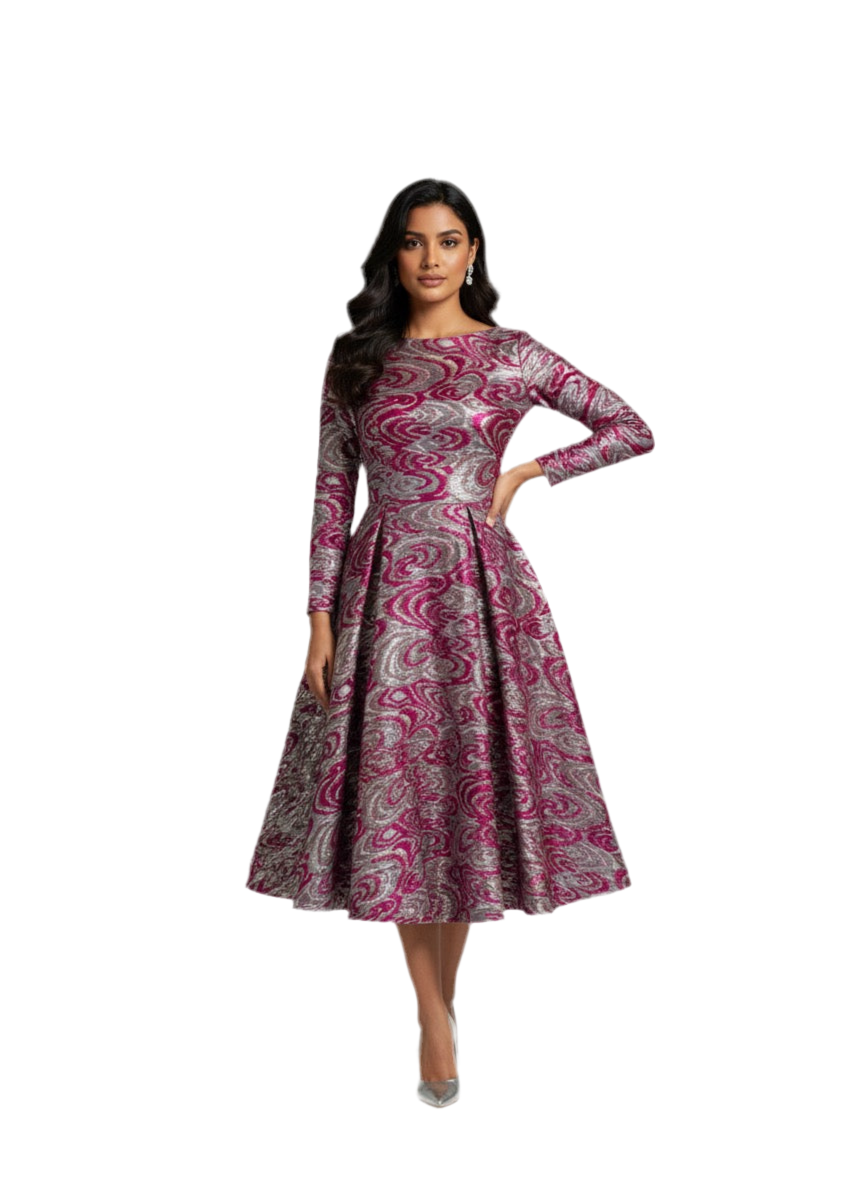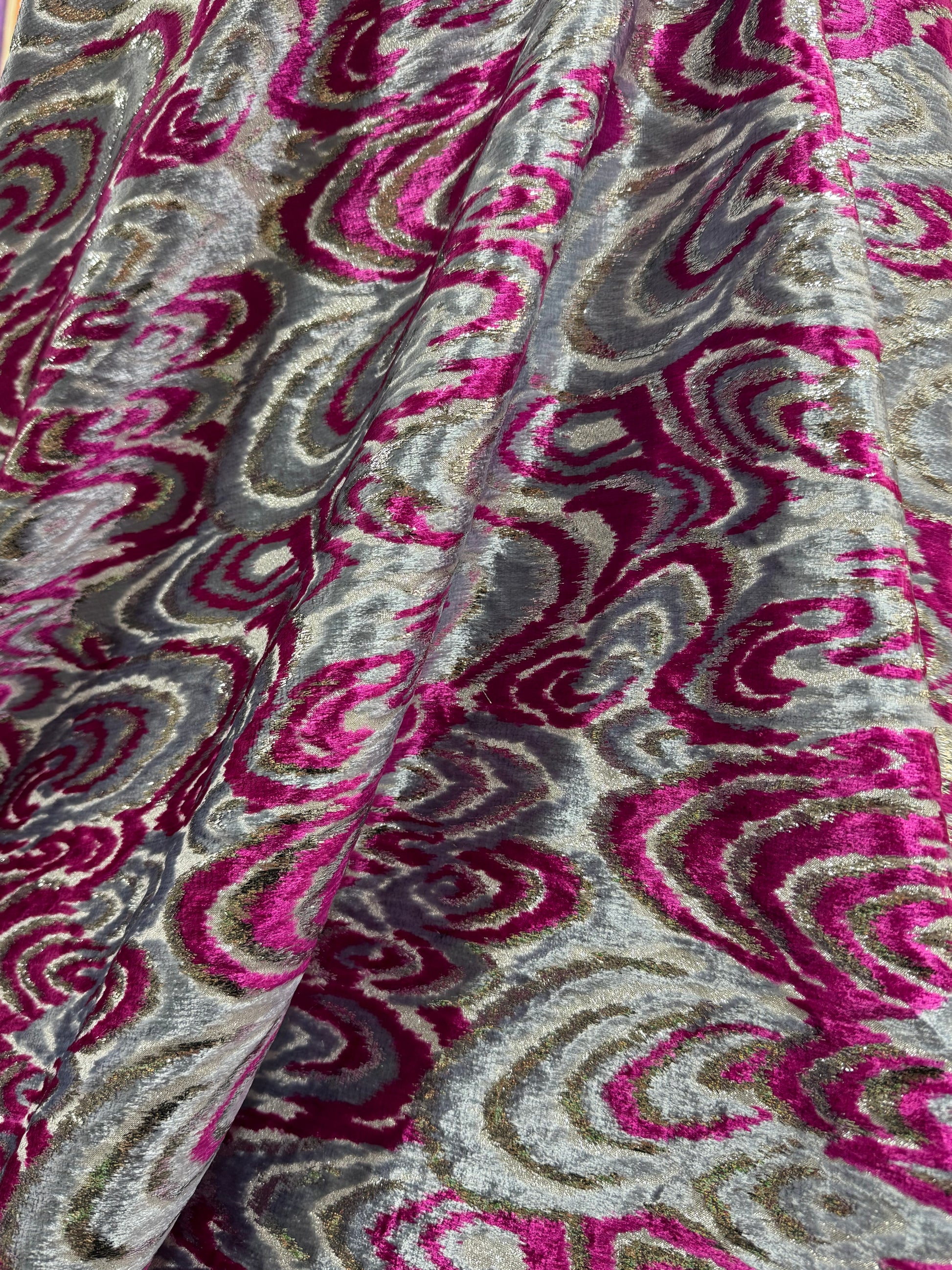 Make a statement with this striking pink and silver metallic velvet fabric, designed with a bold abstract swirl pattern that catches the light beautifully. Crafted from a polyester and metallic blend, it offers both texture and shimmer, making it perfect for evening-wear, gowns, tailored suits, skirts, or standout jackets.
