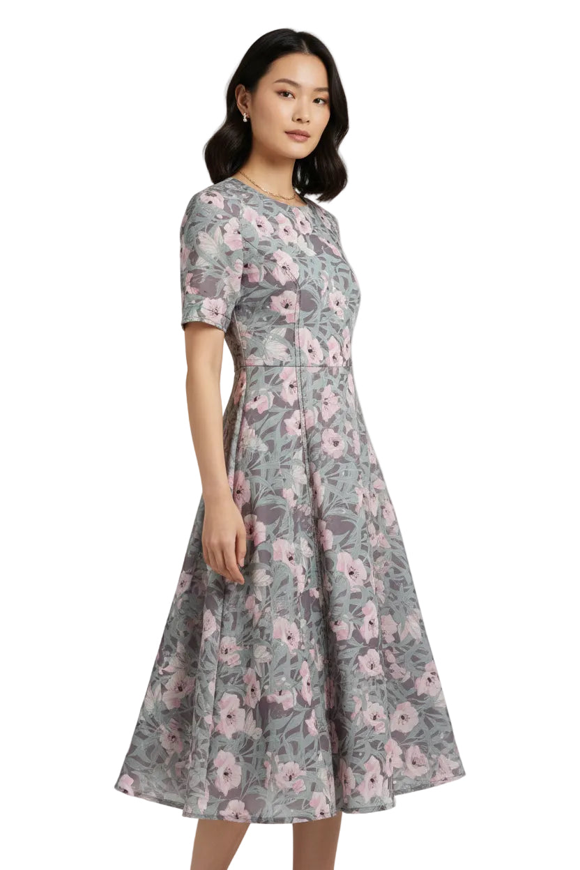A lightweight polyester fabric featuring a soft floral print in muted pink tones on a grey background, with flowing leaf detailing for a modern, elegant look.