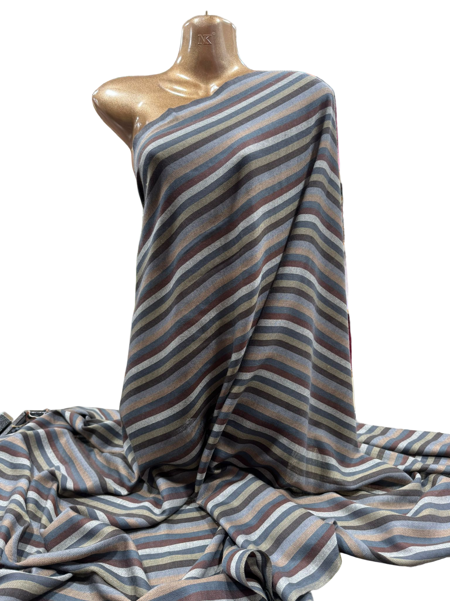 Featuring a modern striped design in earthy browns, greys, and muted beige tones, it offers both warmth and refined style. The soft, breathable fabric drapes elegantly, while twisted tassels add a subtle finishing touch. Perfect for both casual layering and evening wear, this versatile piece transitions effortlessly through the seasons.